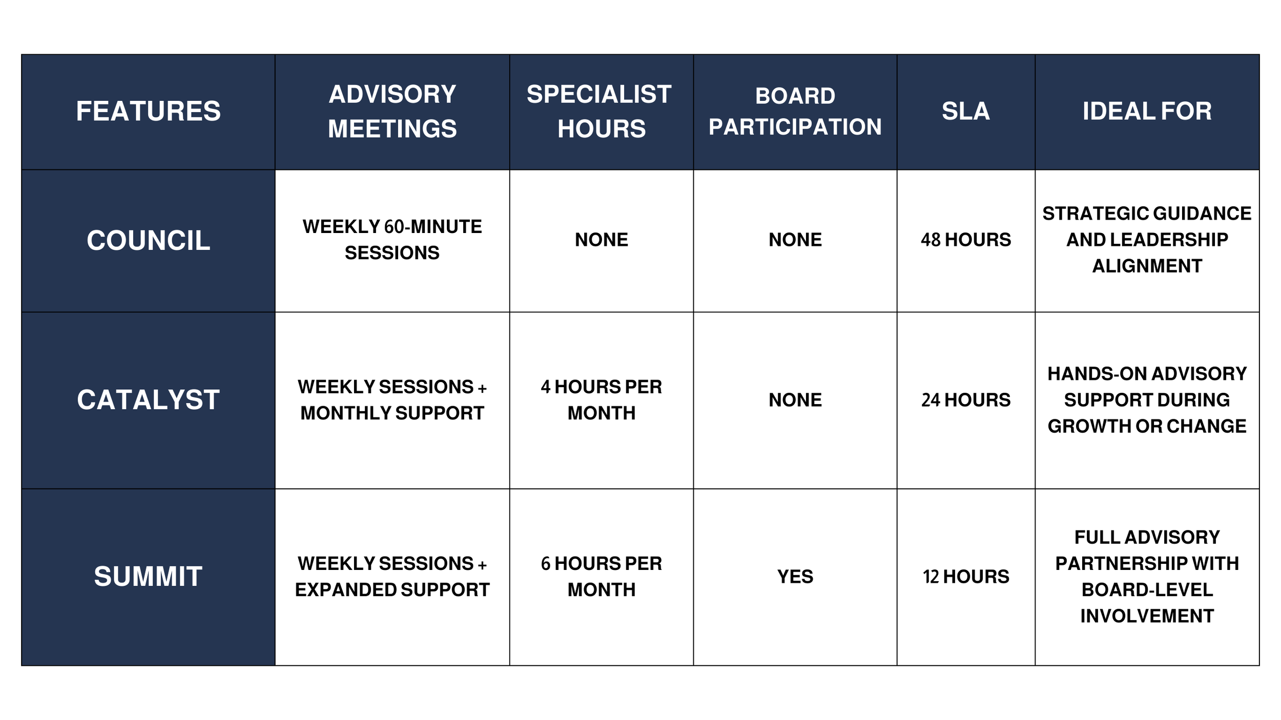Council is designed for organizations seeking consistent, executive-level guidance without day-to-day operational involvement. This tier provides structured advisory support focused on alignment, governance awareness, and long-term stability.